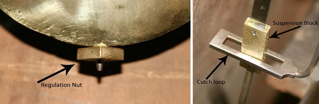If the tick is uneven then you will need to adjust the crutch to obtain an “In Beat” tick. Holding the pendulum bob in a central position move the bob to the right and then back to the left. If the longest gap is when the bob is swinging to the right then the crutch needs to be bent to the left and if the longest gap is when the bob is swinging to the left then the crutch needs to be bent to the right. With small adjustments on both sides you should obtain an even tick. If the tick is uneven the clock will usually stop. It’s also important to make sure that the suspension block is in a central position within the crutch loop. Bending the crutch either forward or backwards will solve this problem.